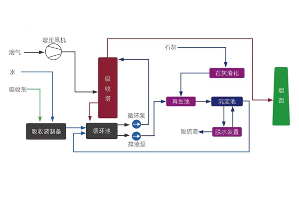 煙氣經增壓風機進入吸收塔,與來自循環泵送入的吸收液接觸并被除去SO2。被洗滌后的煙氣經塔內除霧器除霧后進入煙肉外排,出吸收塔的吸收液返回循環池循環使用。當循環池內吸收液的PH值降低至設定值時,排液泵自動啟動。將需再牛的吸收液泵入再生池進行再生(使用石灰漿液再生),然后進入沉淀池進行沉淀,沉淀池的上清液返回循環池。沉淀池的沉渣( 硫酸鈣及亞硫酸鈣)進入脫水裝置,脫水裝置形成的(濕)固態物即為脫硫渣,定期外排脫水裝置脫出的水返回沉淀池。運行過程中,應定期向循環池中加入新鮮的吸收液,以補充吸收液中所含的鈉堿量。